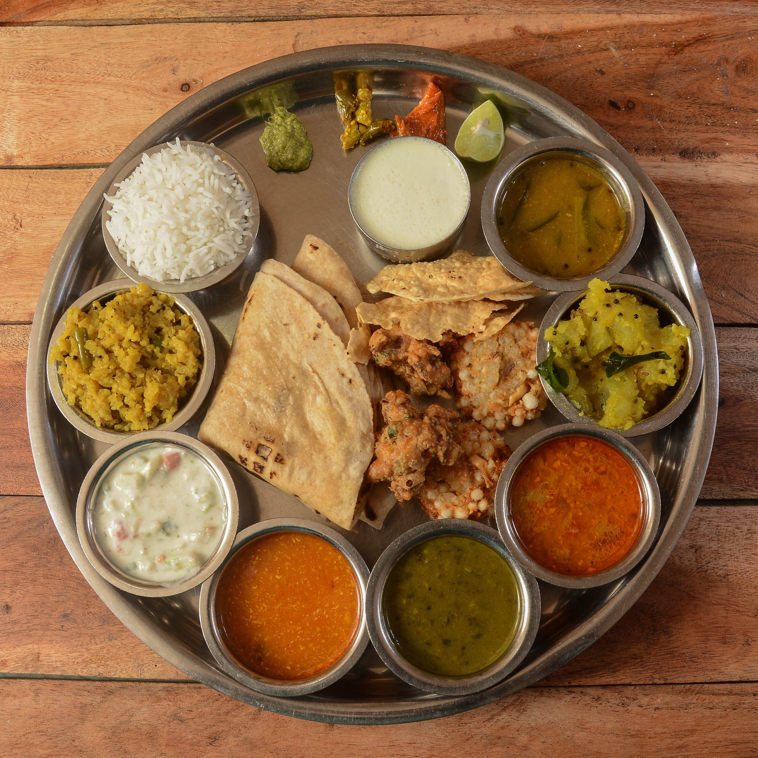 Steamed Rice, Chapati / Roti, Dal / Sambar / Rasam, Vegetable Curry (seasonal), Dry Vegetable, Curd / Buttermilk, Pickle & Papad